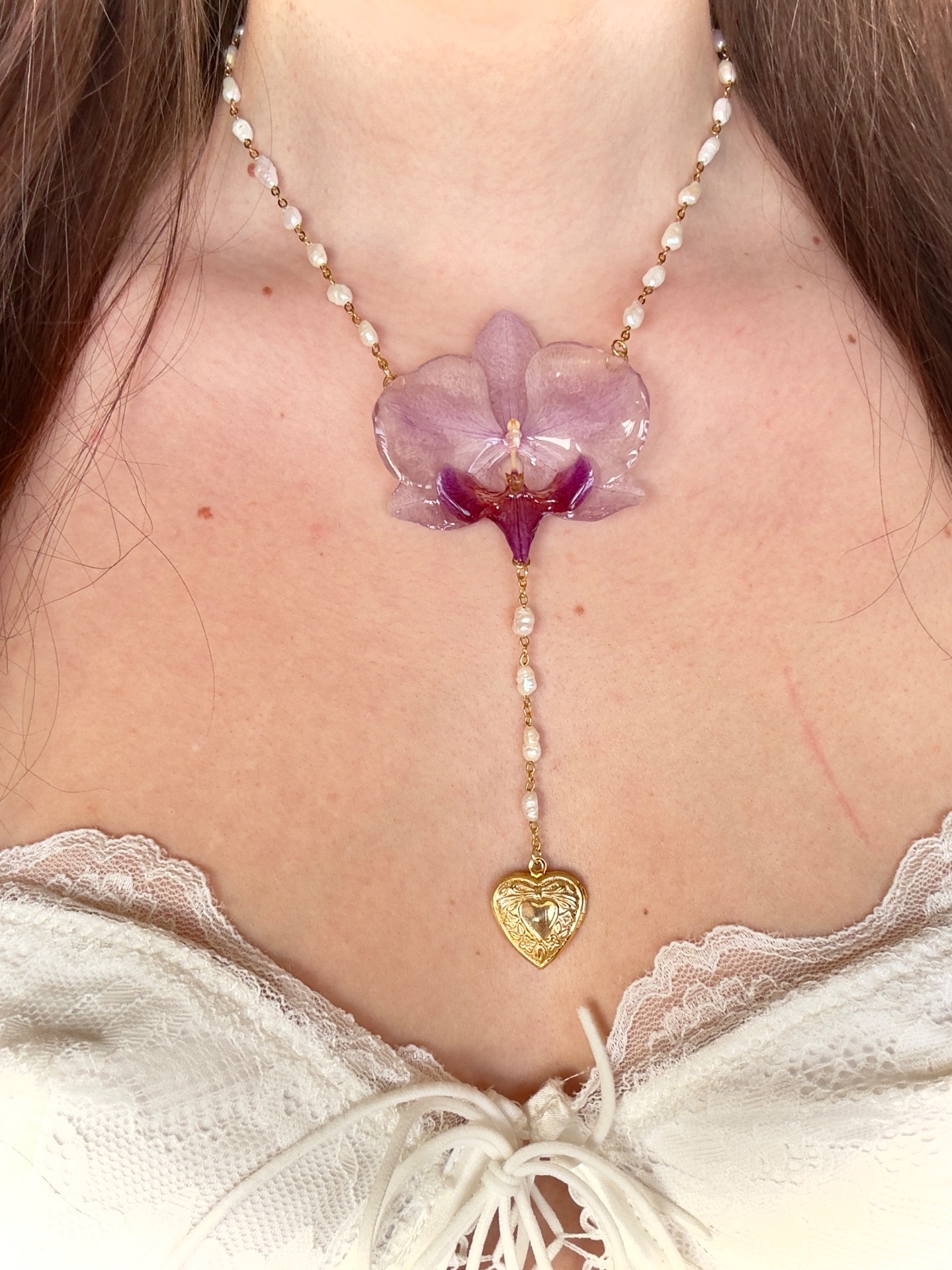 Pearl amulet dainty orchid necklace